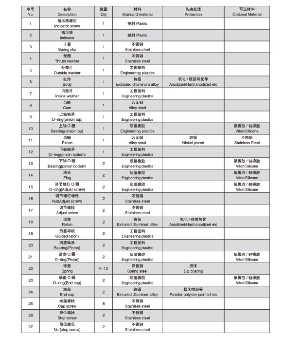 (10)具有专利的通用输出轴和多功能指示器、定位器、手动涡轮机构等可选用,亦可以选择双动(DA)、单动(SR)、供给气源:2.5~8 bar、扭力:3.0~4150。